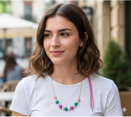 Vista rápida COLLAR DE PERLAS DE CRISTAL Y LAVA COLOR ROSA Y VERDE 32,00 € Collar elaborado con perlas de cristal blanco y bolas de lava volcánica en tres colores: verde, rosa y fucsia claro. Cadena dorada y cuero rosa...