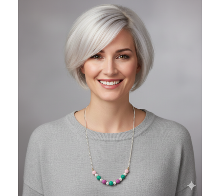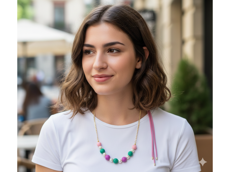Collar elaborado con perlas de cristal blanco y bolas de lava volcánica en tres colores: verde, rosa y fucsia claro. Cadena dorada y cuero rosa para darle extensión. Cierre deslizante ajustable. Largo entre 20 y 40 cm. El tamaño de las cuentas es de 8 y 10 mm.