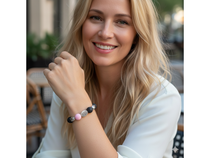 Pulsera elaborada con cuentas de lava volcánica, de color negro y rosa, y piezas de zamak. Mide 19 cm y lleva cierre de mosquetón plateado. Puede ajustarse a medida.